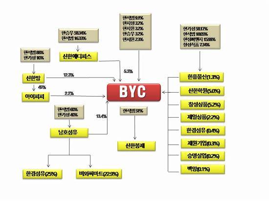 BYC의 대주주인 남호석유와 신한방은 BYC 창업주 한영대 회장의 차남인 한석범 BYC 사장이 대부분의 지분을 보유한 기업들이다.