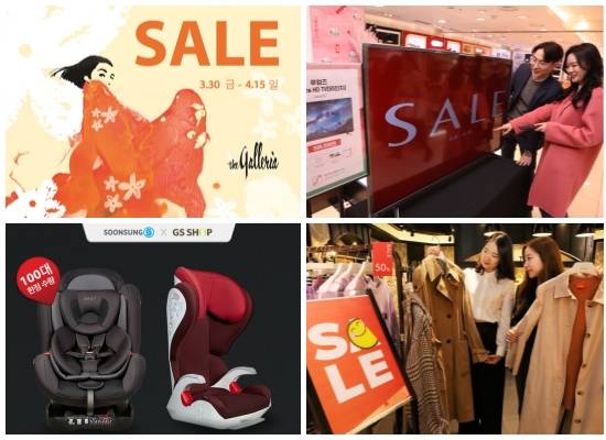 (왼쪽부터 시계방향) 갤러리아백화점 이탈리아 캐주얼 브랜드 특집전, 롯데백화점 '대형가전·가구' 할인 행사, 현대백화점 봄 상품 특별 할인전, GS샵 '순성 카시트' 단독 할인행사. ⓒ 각 사