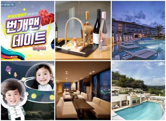 (왼쪽부터 시계방향) 롯데호텔 번개맨 프로모션·Lovely Wine Blossom 패키지, 제주신라호텔 '어메이징 프라이데이' 패키지, 서울신라호텔 인비테이션 투 서머' 패키지, 신라스테이 이그제큐티브 라운지, 글래드호텔 '효캉스·키즈 플레이' 패키지. ⓒ 각 사