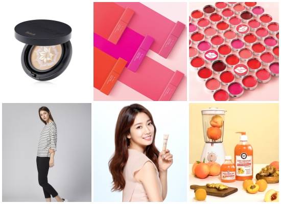 (왼쪽부터 시계방향) 김정문알로에 베루시에 럭셔리 로에센스 팩트, 뉴스킨 2018 SS 뉴컬러 메이크업 3종, 라네즈 틴 틴트 밤, 해피바스 쥬스 스무디 애프리콧 바디워시, 마몽드 올 스테이 파운데이션, 롯데닷컴 '로썸 스튜디오' 론칭. ⓒ 각 사