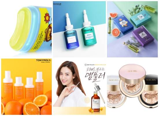 (왼쪽부터 시계방향) LG생활건강 원샷썬킬 와이드 선스틱·더마리프트 고효능&즉각 개선 세럼 프로모션, 제이준코스메틱 '에센셜 테라피 마스크' 3종, 애경산업 시그니처 에센스 커버 팩트, 에이블씨엔씨 미샤 비폴렌 리뉴 라인, 토니모리 '바이탈 비타 12' 스킨 케어. ⓒ 각 사