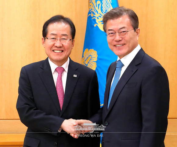 문재인 대통령이 지난 13일 오후 청와대 본관 백악실에서 홍준표 자유한국당 대표와 회담에 앞서 악수하고 있다. ⓒ 청와대
