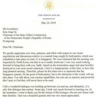 도널드 트럼프 미국 대통령의 싱가포르 회담 취소 통지 서한. ⓒ 백악관