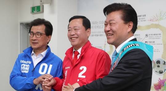 이시종 민주당 후보, 박경국 자유한국당 후보, 신용한 바른미래당 후보가 손을 맞잡고 있다. ⓒ 뉴스1
