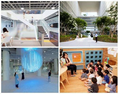 (왼쪽부터 시계방향) 아모레퍼시픽그룹 신본사의 사무공간, 루프가든, 어린이집, 미술관. ⓒ 아모레퍼시픽