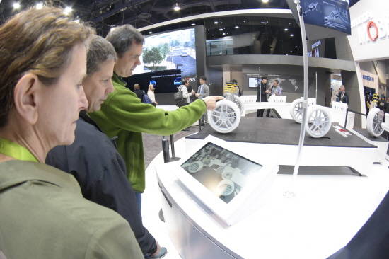 현대모비스가 지난 CES에서 선보인 친환경·샤시·조향·제동 통합부품 ‘e-코너 모듈’을 관계자들이 살펴 보고 있다. ⓒ 현대모비스
