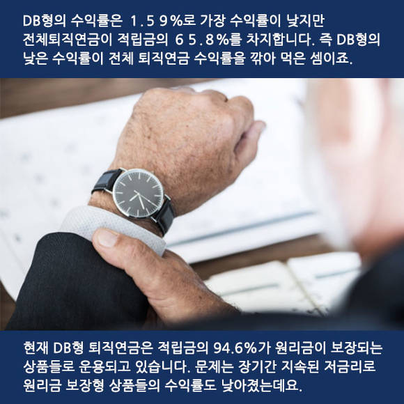 퇴직연금의 수익률 감소는 DB형 연금의 영향이 가장 큰데요. 퇴직연금은 크게 DB형(확정급여형)과 DC형(확정기여형), IRP(개인형 퇴직연금)로 나뉩니다. DB형의 수익률은1.59%로 가장 수익률이 낮지만 전체 퇴직연금이 적립금의65.8%를 차지합니다. 즉 DB형의 낮은 수익률이 전체 퇴직연금 수익률을 깎아 먹은 셈이죠. 현재 DB형 퇴직연금은 적립금의 94.6%가 원리금이 보장되는 상품들로 운용되고 있습니다. 문제는 장기간 지속된 저금리로 원리금 보장형 상품들의 수익률도 낮아졌습니다.