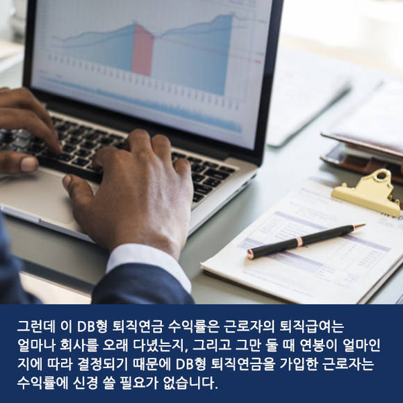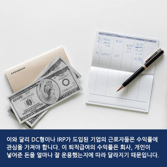 그런데 이 DB형 퇴직연금 수익률은 근로자의 퇴직급여는 얼마나 회사를 오래 다녔는지, 그리고 그만 둘 때 연봉이 얼마인 지에 따라 결정되기 때문에 DB형 퇴직연금을 가입한 근로자는 수익률에 신경 쓸 필요가 없습니다. 이와 달리 DC형이나 IRP가 도입된 기업의 근로자들은 수익률에 관심을 가져야 합니다. 이 퇴직급여의 수익률은 회사, 개인이 넣어준 돈을 얼마나 잘 운용했는지에 따라 달라지기 때문입니다.