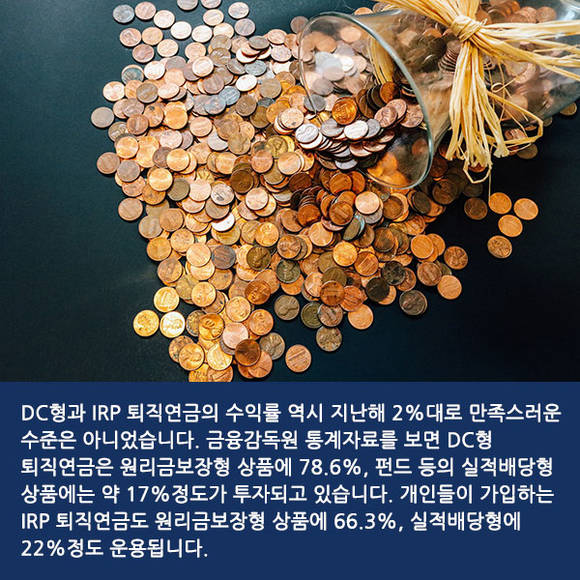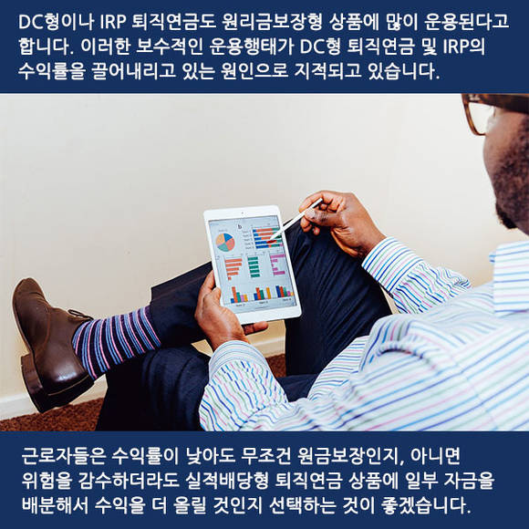 DC형이나 IRP 퇴직연금도 원리금보장형 상품에 많이 운용된다고 합니다. 이러한 보수적인 운용행태가 DC형 퇴직연금 및 IRP의 수익률을 끌어내리고 있는 원인으로 지적되고 있습니다. 근로자들은 수익률이 낮아도 무조건 원금보장인지, 아니면 위험을 감수하더라도 실적배당형 퇴직연금 상품에 일부 자금을 배분해서 수익을 더 올릴 것인지 선택하는 것이 좋겠습니다.