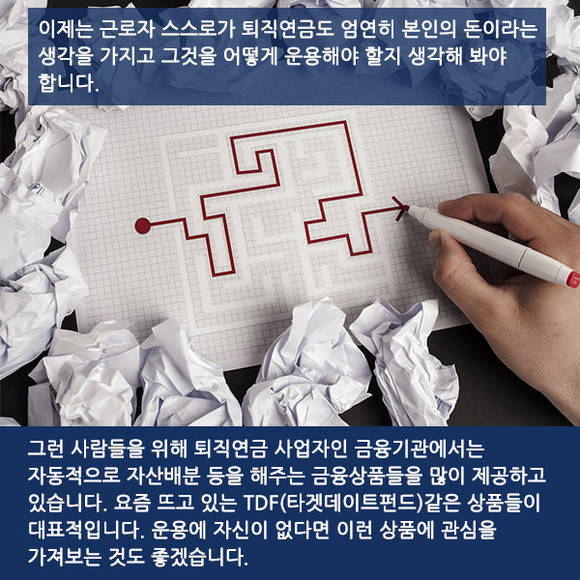 이제는 근로자 스스로가 퇴직연금도 엄연히 본인의 돈이라는 생각을 가지고 그것을 어떻게 운용해야 할지 생각해 봐야 합니다. 그런 사람들을 위해 퇴직연금 사업자인 금융기관에서는 자동적으로 자산배분 등을 해주는 금융상품들을 많이 제공하고 있습니다. 요즘 뜨고 있는 TDF(타겟데이트펀드)같은 상품들이 대표적입니다. 운용에 자신이 없다면 이런 상품에 관심을 가져보는 것도 좋겠습니다.