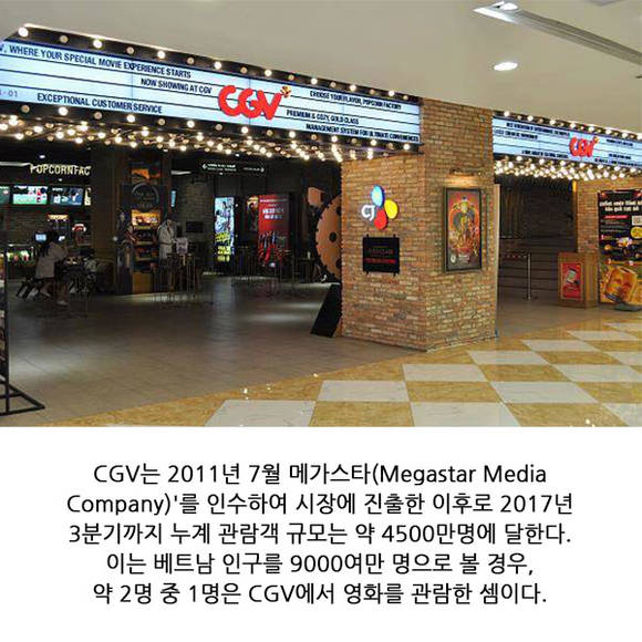 CJ CGV는 지난 2011년 7월 베트남 현지 1위 멀티플렉스인 '메가스타(Megastar Media Company)'를 인수, 베트남 시장에 진출했다.