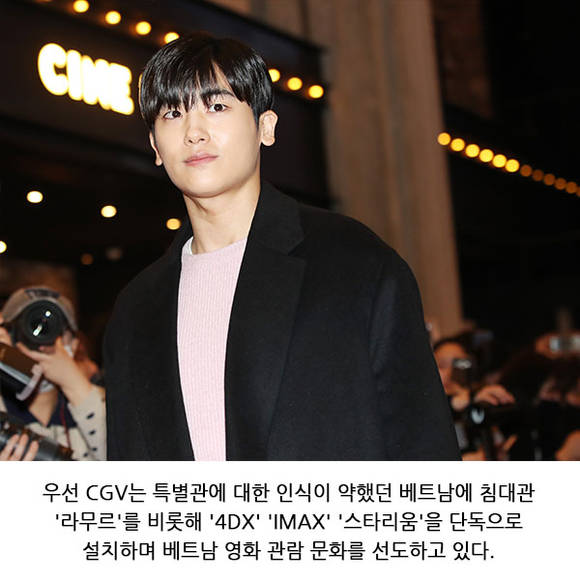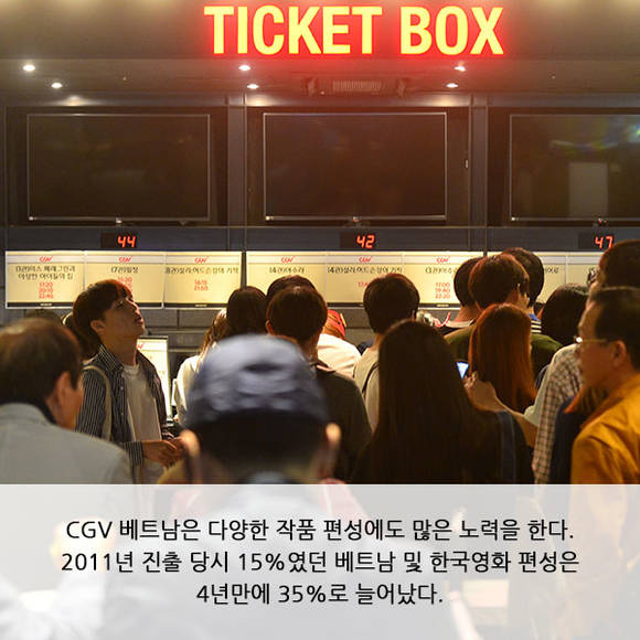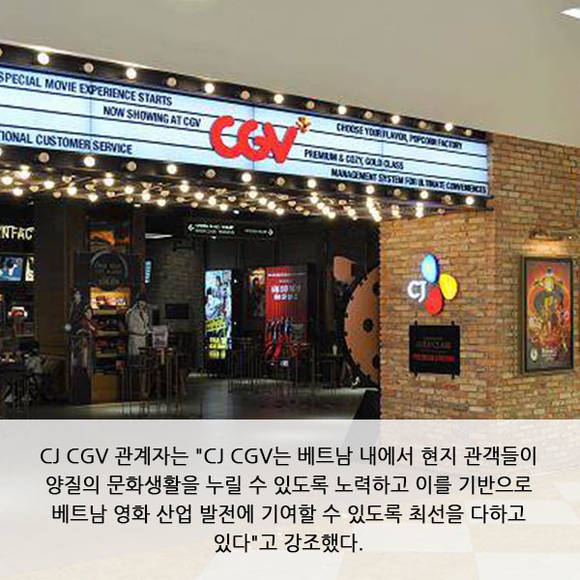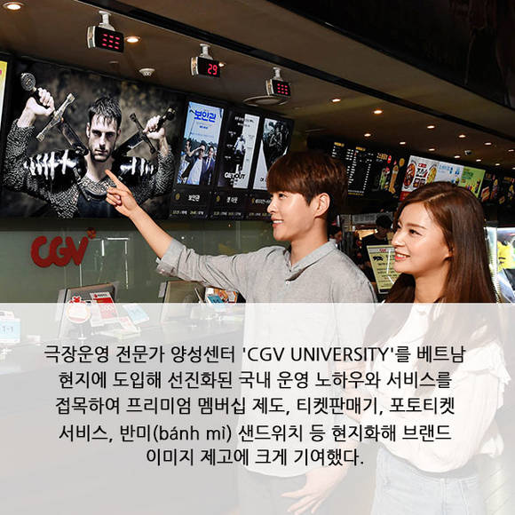 우선 CJ CGV는 특별관에 대한 인식이 약했던 베트남에 침대관 '라무르'를 비롯해 '4DX' 'IMAX' '스타리움'을 단독으로 설치하며 베트남 영화 관람 문화를 선도하고 있다. 또 극장운영 전문가 양성센터 'CGV UNIVERSITY'를 베트남 현지에 도입해 선진화된 국내 운영 노하우와 서비스를 접목해 프리미엄 멤버십 제도, 티켓판매기, 포토티켓 서비스, 반미(bánh mì) 샌드위치 등 현지화한 매점 신메뉴 도입 등을 도입했고, 이를 통해 브랜드 이미지 제고에 크게 기여했다.