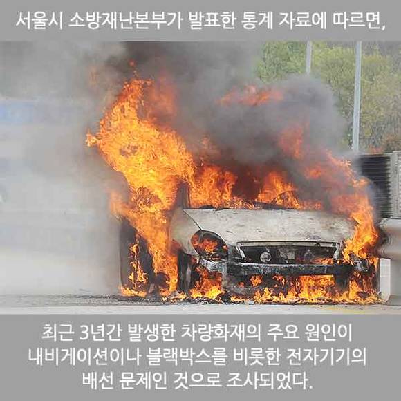 서울시 소방재난본부가 발표한 통계 자료에 따르면, 최근 3년간 발생한 차량화재의 주요 원인이 내비게이션이나 블랙박스를 비롯한 전자기기의 배선 문제인 것으로 조사되었다.