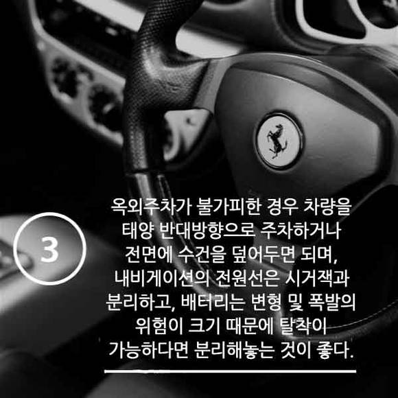 옥외주차가 불가피한 경우 차량을 태양 반대방향으로 주차하거나 전면에 수건을 덮어두면 되고, 내비게이션의 전원선은 시거잭과 분리하고, 배터리는 변형 및 폭발의 위험이 크기 때문에 탈착이 가능하다면 분리해놓는 것이 좋다.