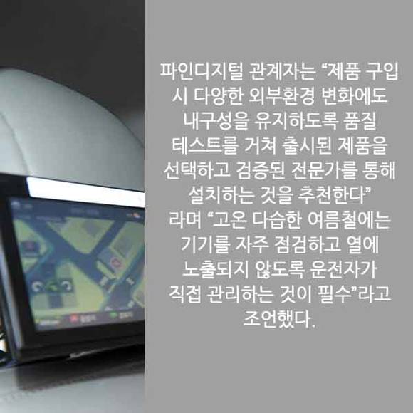 파인디지털 관계자는 "제품 구입 시 다양한 외부환경 변화에도 내구성을 유지하도록 품질 테스트를 거쳐 출시된 제품을 선택하고 검증된 전문가를 통해 설치하는 것을 추천한다"며 "고오다습한 여름철에는 기기를 자주 점검하고 열에 노출되지 않도록 운전자가 직접 관리하는 것이 필수"라고 조언했다.