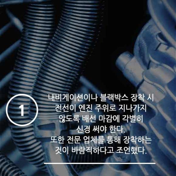 먼저 내비게이션이나 블랙박스 장착 시 추가되는 전선이 엔진 주위로 지나가지 않도록 배선 마감에 각별히 신경써야 하고, 차량이나 전자기기에 대한 전문지식이 부족한 운전자라면 내비게이션이나 블랙박스를 직접 장착하는 것보다 전문 업체를 통해 장착하는 것이 바람직하다고 조언했다.
