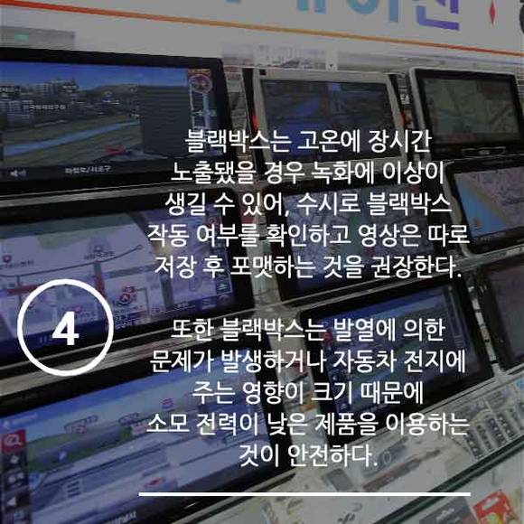 이와 더불어 블랙박스는 고온에 장시간 노출됐을 경우 순간적으로 기기 온도가 상승해 녹화에 이상이 생길 수 있기 때문에 수시로 블랙박스 작동 여부를 확인하고 영상은 따로 저장 후 포맷하는 것을 권장한다.