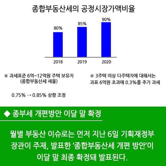 월별 부동산 이슈로는 먼저 지난 6일 기획재정부 장관이 주재, 발표한 '종합부동산세 개편방안'이 이달 말 최종 확정돼 발표된다.