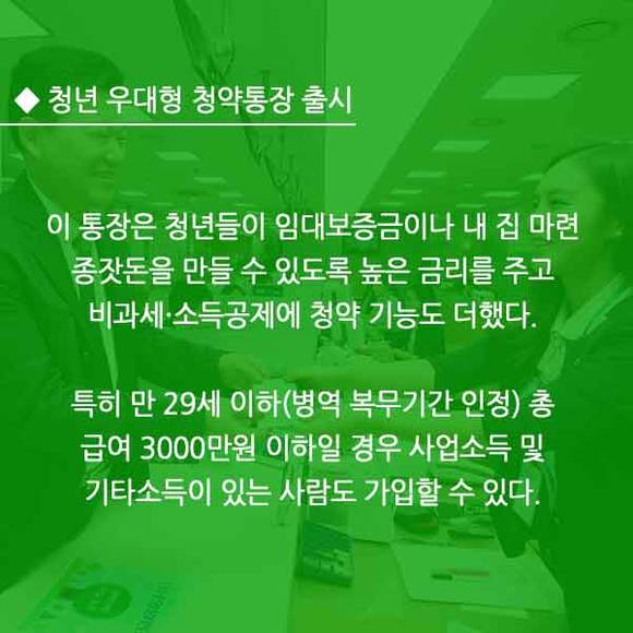 이 통장은 청년들이 임대보증금이나 내 집 마련 종잣돈을 만들 수 있도록 높은 금리를 주고 비과세·소득공제에 청약 기능도 더했다. 특히 만 29세 이하(병역 복무기간 인정) 총 급여 3000만원 이하일 경우 사업소득 및 기타소득이 있는 사람도 가입할 수 있다.