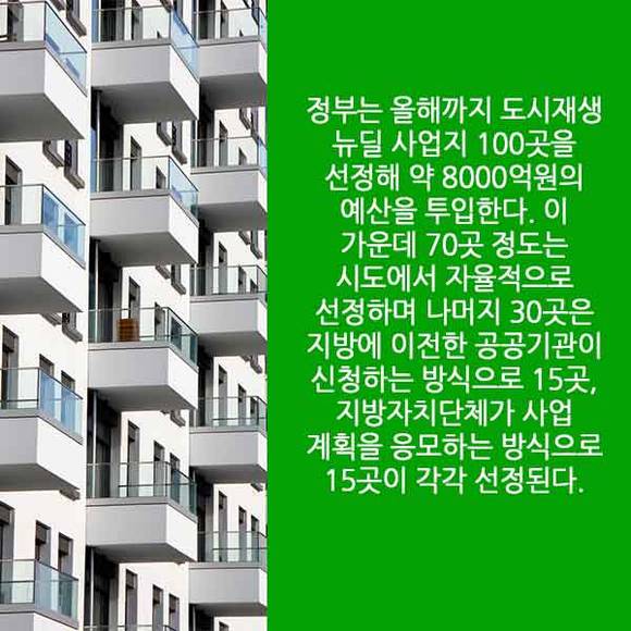 정부는 올해까지 도시재생 뉴딜 사업지 100곳을 선정해 약 8000억원의 예산을 투입한다. 이 가운데 70곳 정도는 시도에서 자율적으로 선정하며 나머지 30곳은 지방에 이전한 공공기관이 신청하는 방식으로 15곳, 지방자치단체가 사업 계획을 응모하는 방식으로 15곳이 각각 선정된다.