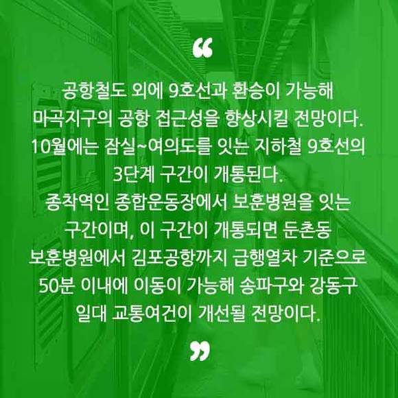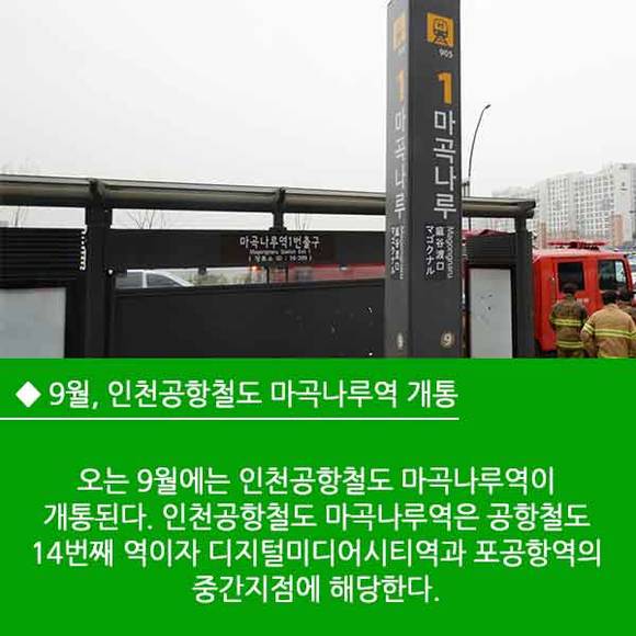 오는 9월에는 인천공항철도 마곡나루역이 개통된다. 인천공항철도 마곡나루역은 공항철도 14번째 역이자 디지털미디어시티역과 김포공항역의 중간지점에 해당한다. 공항철도 외에 9호선과 환승이 가능해 마곡지구의 공항 접근성을 향상시킬 전망이다.
