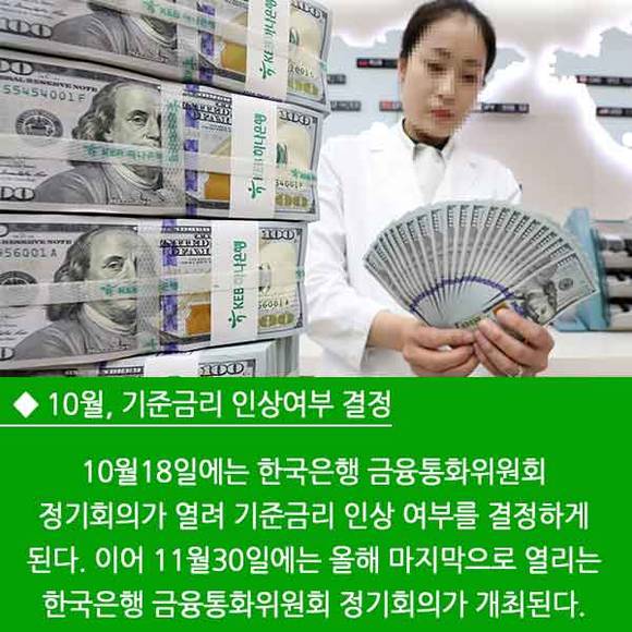 10월18일에는 한국은행 금융통화위원회 정기회의가 열려 기준금리 인상 여부를 결정하게 된다. 이어 11월30일에는 올해 마지막으로 열리는 한국은행 금융통화위원회 정기회의가 개최된다.