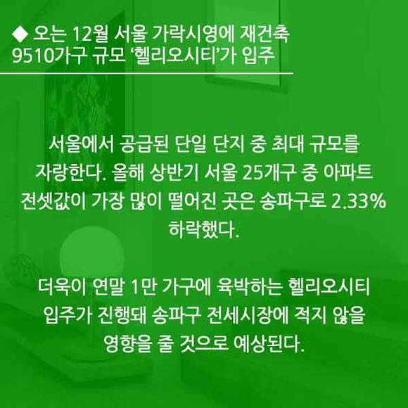 서울에서 공급된 단일 단지 중 최대 규모를 자랑한다. 올해 상반기 서울 25개구 중 아파트 전셋값이 가장 많이 떨어진 곳은 송파구로 2.33% 하락했다. 더욱이 연말 1만 가구에 육박하는 헬리오시티 입주가 진행돼 송파구 전세시장에 적지 않을 영향을 줄 것으로 예상된다.