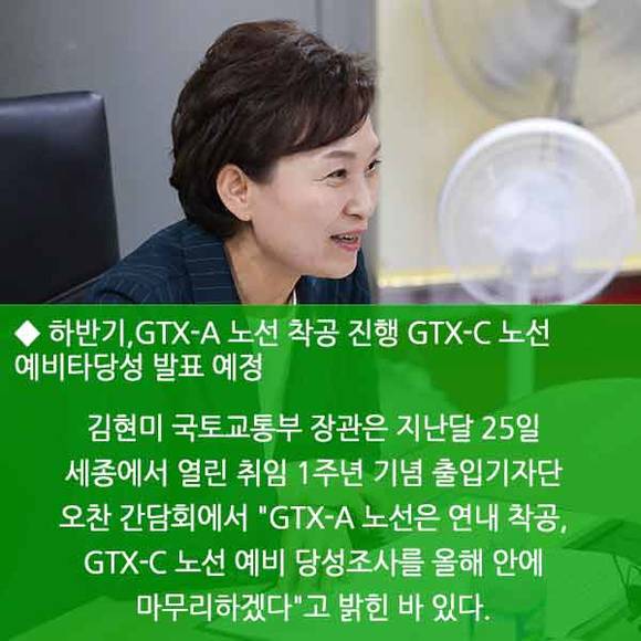 김현미 국토교통부 장관은 지난달 25일 세종에서 열린 취임 1주년 기념 출입기자단 오찬 간담회에서 "GTX-A 노선은 연내 착공, GTX-C 노선 예비타당성조사를 올해 안에 마무리하겠다"고 밝힌 바 있다.