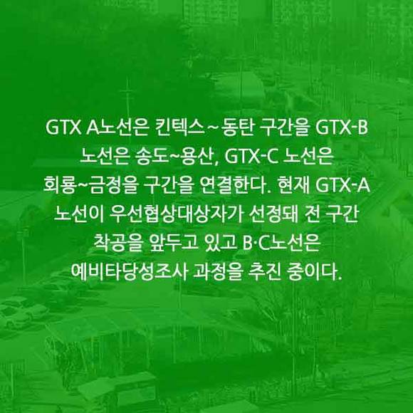 GTX A노선은 킨텍스∼동탄 구간을 GTX-B 노선은 송도~용산, GTX-C 노선은 회룡~금정을 구간을 연결한다. 현재 GTX-A노선이 우선협상대상자가 선정돼 전 구간 착공을 앞두고 있고 B·C노선은 예비타당성조사 과정을 추진 중이다.