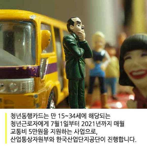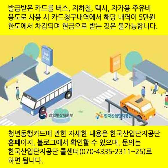 청년동행카드는 만 15~34세에 해당되는 청년근로자에게 7월1일부터 2021년까지 매월 교통비 5만원을 지원하는 사업으로, 산업통상자원부와 한국산업단지공단이 진행합니다.