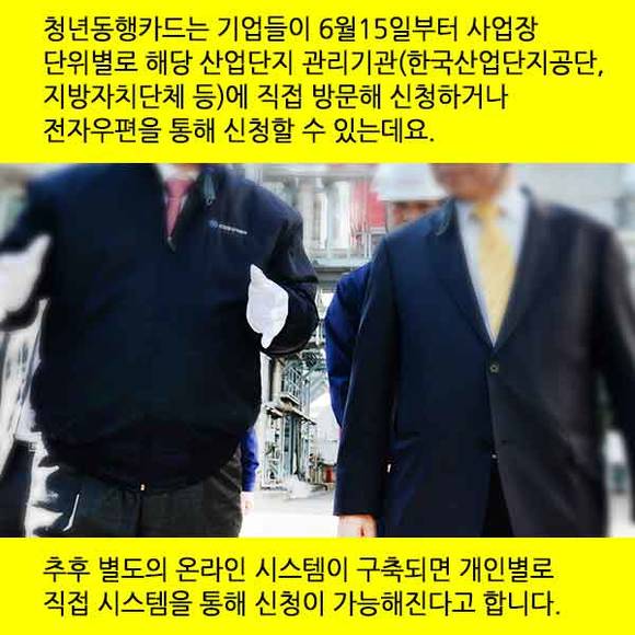 청년동행카드는 기업들이 6월15일부터 사업장 단위별로 해당 산업단지 관리기관(한국산업단지공단, 지방자치단체 등)에 직접 방문해 신청하거나 전자우편을 통해 신청할 수 있는데요. 추후 별도의 온라인 시스템이 구축되면 개인별로 직접 시스템을 통해 신청이 가능해진다고 합니다.