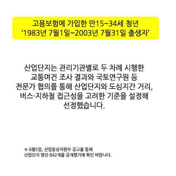 지원대상으로 고용보험에 가입한 만15~34세 청년(1983년 7월1일부터 2003년 7월31일 출생자)이며 산업단지는 관리기관별로 두 차례 시행한 교통여건 조사 결과와 국토연구원 등 전문가 협의를 통해 산업단지와 도심지간 거리, 버스·지하철 접근성을 고려한 기준을 설정해 선정하여 6월5일, 산업통상자원부 공고를 통해 산업단지 명단 842개를 공개를 했습니다.
