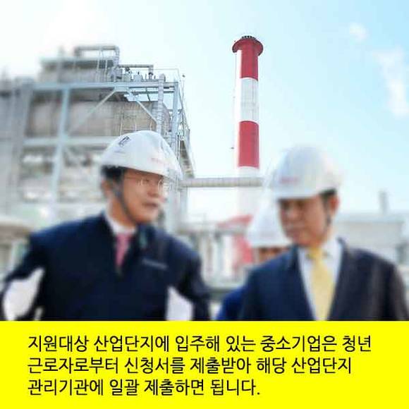 지원대상 산업단지에 입주해 있는 중소기업은 청년 근로자로부터 신청서를 제출받아 해당 산업단지 관리기관에 일괄 제출하면 됩니다.