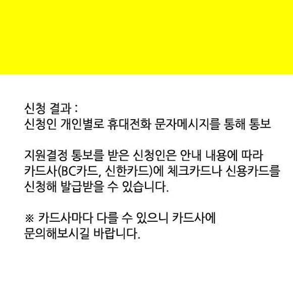 신청 결과는 신청인 개인별로 휴대전화 문자메시지를 통해 통보를 합니다. 그리고 지원결정 통보를 받은 신청인은 안내 내용에 따라 카드사(BC카드, 신한카드)에 체크카드나 신용카드를 신청해 발급받을 수 있습니다. 카드사마다 다를 수 있으니 카드사에 문의해보시길 바랍니다.