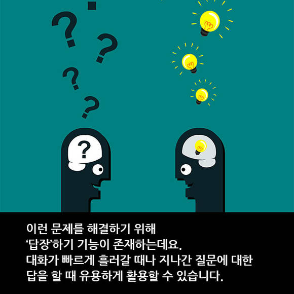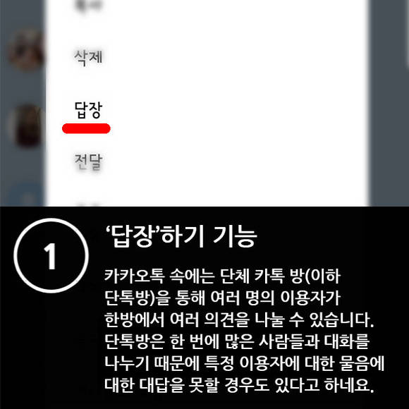 카카오톡 속에는 단체 카톡 방(이하 단톡방)을 통해 여러 명의 이용자가 한방에서 여러 의견을 나눌 수 있습니다. 단톡방은 한 번에 많은 사람들과 대화를 나누기 때문에 특정 이용자에 대한 물음에 대한 대답을 못할 경우도 있다고 하네요. 이런 문제를 해결하기 위해 '답장'하기 기능이 존재하는데요. 대화가 빠르게 흘러갈 때나 지나간 질문에 대한 답을 할 때 유용하게 활용할 수 있습니다.
