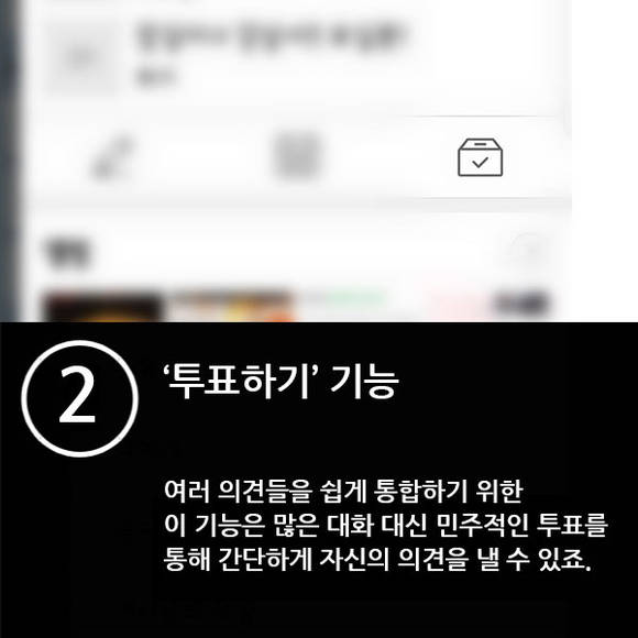 '투표하기' 기능도 있는데요. 여러 의견들을 쉽게 통합하기 위한 이 기능은 많은 대화 대신 민주적인 투표를 통해 간단하게 자신의 의견을 낼 수 있죠.