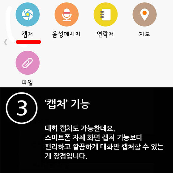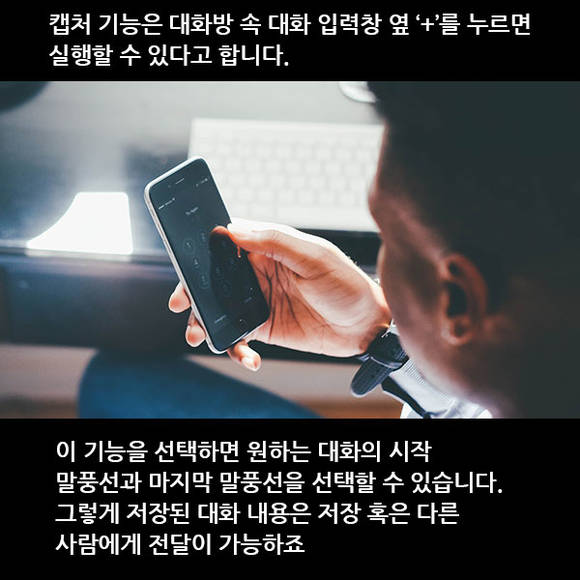 '캡처' 기능을 통해 대화 캡처도 가능한데요. 스마트폰 자체 화면 캡처 기능보다 편리하고 깔끔하게 대화만 캡처할 수 있는 게 장점입니다.캡처 기능은 대화방 속 대화 입력창 옆 '+'를 누르면 실행할 수 있다고 합니다. 이 기능을 선택하면 원하는 대화의 시작 말풍선과 마지막 말풍선을 선택할 수 있습니다. 그렇게 저장된 대화 내용은 저장 혹은 다른 사람에게 전달이 가능하죠