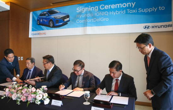 현대차는 26일 서울 강남구 소재 코엑스 인터컨티넨탈 호텔에서 싱가포르 운수기업 컴포트 델그로社와 아이오닉 하이브리드 택시 최대 1200대 공급 계약을 체결했다고 밝혔다. 이날 체결식은 김형정 현대자동차 사업관리본부장 부사장과 림짓포 컴포트 델그로 그룹 회장, 양반셍 사장 등 양사 관계자가 참석한 가운데 진행됐다.