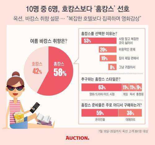 옥션이 지난 18일부터 26일까지 9일 동안 고객 총 891명을 대상으로 '홈캉스 vs 호캉스' 선호도에 대해 조사한 결과, 전체 응답자 중 58%가 집에서 즐기는 '홈캉스'를 선택했다고 30일 알렸다.