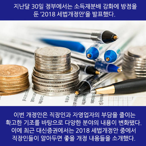 [프라임경제] 지난달 30일 정부에서는 소득재분배 강화에 방점을 둔 '2018 세법개정안'을 발표했다. 이번 개정안은 직장인과 자영업자의 부담을 줄이는 확고한 기조를 바탕으로 다양한 분야의 내용이 변화됐다. 이에 최근 대신증권에서는 2018 세법개정안 중에서 직장인들이 알아두면 좋을 개정 내용들을 소개했다.
