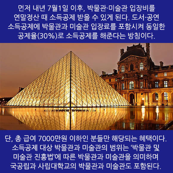 단, 총 급여 7000만원 이하인 분들만 해당되는 혜택이다. 소득공제 대상 박물관과 미술관의 범위는 '박물관 및 미술관 진흥법'에 따른 박물관과 미술관을 의미하며 국공립과 사립대학교의 박물관과 미술관도 포함된다.