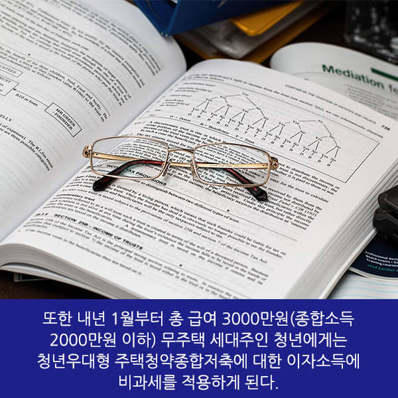 또한 내년 1월부터 총 급여 3000만원(종합소득 2000만원 이하) 무주택세대주인 청년에게는 청년우대형 주택청약종합저축에 대한 이자소득에 비과세를 적용하게 된다.