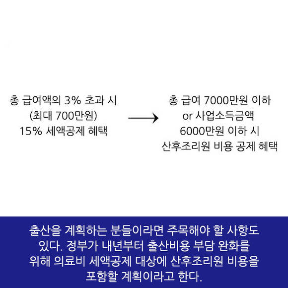 그리고 출산을 계획하는 분들이라면 주목해야 할 사항도 있다. 정부가 내년부터 출산비용 부담 완화를 위해 의료비 세액공제 대상에 산후조리원 비용을 포함할 계획이라고 한다.