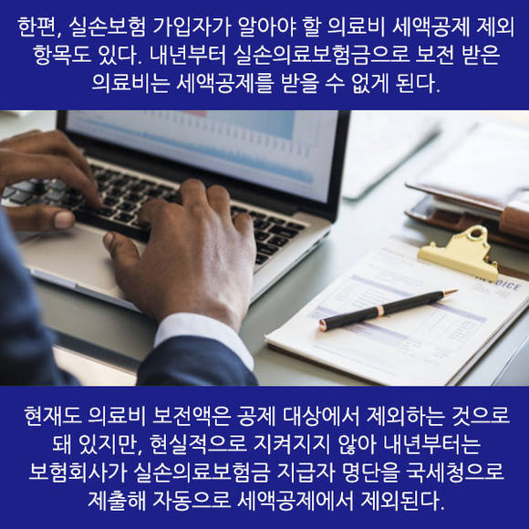 한편, 실손보험 가입자가 알아야 할 의료비 세액공제 제외 항목도 있다. 내년부터 실손의료보험금으로 보전 받은 의료비는 세액공제를 받을 수 없게 된다.현재도 의료비 보전액은 공제 대상에서 제외하는 것으로 돼 있지만, 현실적으로 지켜지지 않아 내년부터는 보험회사가 실손의료보험금 지급자 명단을 국세청으로 제출해 자동으로 세액공제에서 제외된다.