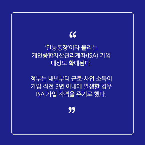 '만능통장'이라 불리는 개인종합자산관리계좌(ISA) 가입 대상도 확대된다. 현재는 가입 당해 혹은 직전 년 근로·사업소득이 있어야 ISA에 가입할 수 있었다. 이에 정부는 내년부터 근로·사업 소득이 가입 직전 3년 이내에 발생할 경우 ISA 가입 자격을 주기로 했다.