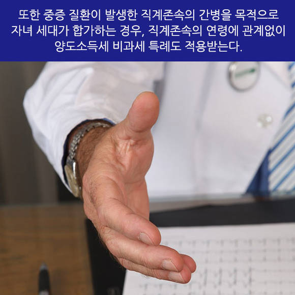 또한 중증 질환이 발생한 직계존속의 간병을 목적으로 자녀 세대가 합가하는 경우, 직계존속의 연령에 관계없이 양도소득세 비과세 특례도 적용받는다.