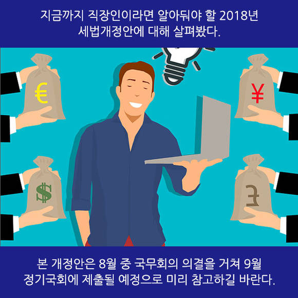 지금까지 직장인이라면 알아둬야 할 2018년 세법개정안에 대해 살펴봤다. 본 개정안은 8월 중 국무회의 의결을 거쳐 9월 정기국회에 제출될 예정으로 미리 참고하길 바란다.