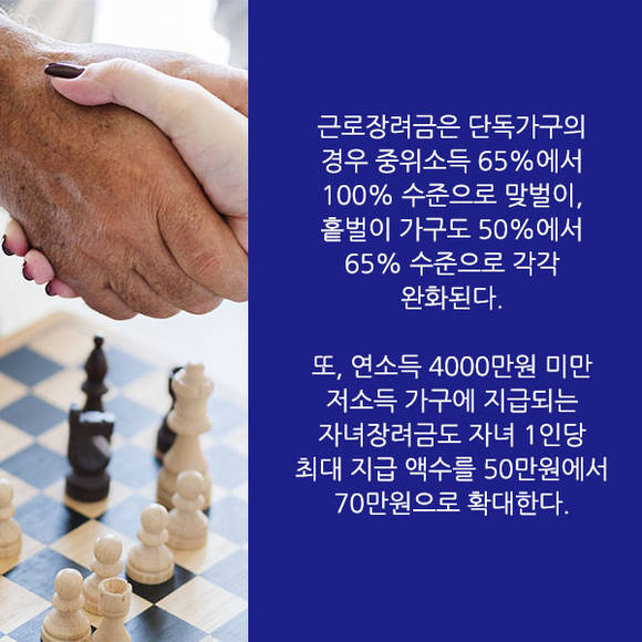 저소득층을 위한 근로장려금과 자녀장려금은 내년부터 대폭 확대된다. 근로장려금은 단독가구의 경우 중위소득 65%에서 100% 수준으로 맞벌이, 홑벌이 가구도 50%에서 65% 수준으로 각각 완화된다. 최대 지급액도 단독 가구는 150만원, 홑벌이 가구는 260만원, 맞벌이 가구는 300만원으로 인상된다. 또, 연소득 4000만원 미만 저소득 가구에 지급되는 자녀장려금도 자녀 1인당 최대 지급 액수를 50만원에서 70만원으로 확대한다.