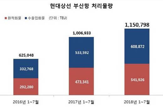 현대상선 관계자는 "2016년 한진 사태 이후 물량 및 서비스 안정화로 부산항 처리 물량이 올 5월~7월에 3개월 연속 17만TEU를 넘어서는 등 매년 사상 최대를 기록 중"이라며 "올해 부산항 처리 물량 200만TEU 달성이 가시화됐다"고 설명했다.