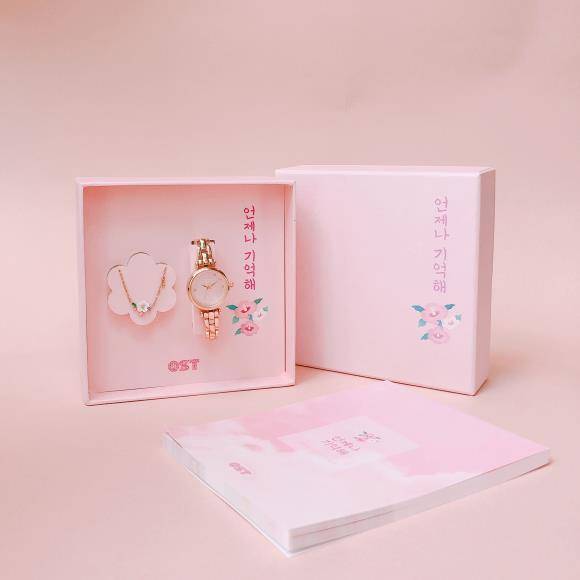 오에스티가 선보인 '언제나 기억해' 상품은 감각적인 디자인에 무궁화 이미지가 새겨진 핑크골드 색상의 '한글 시계'와 하얀 자개로 무궁화 꽃잎을 형상화한 '무궁화 목걸이'가 함께 구성 됐으며 꼼꼼히 일상을 기록 할 수 있는 메모지를 사은품으로 증정 한다.